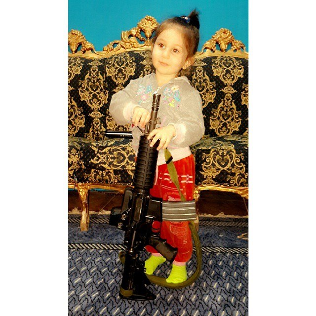 Kjo fotografi që është bërë nga një militant i IS-it çeçen, tregon të bijën e tij Hadija, duke mbajtur një pushkë.