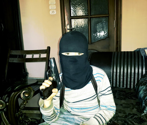 I mbuluar me një kapele të zeze, ku shkruhej "la ilaha illallah" (nuk ka zot tjetër përveç Allahut) -- ashtu siç është e shkruar në flamurin e zi të IS-it -- fëmija, Abu Usama al-Salafi, ngre gishtin tregues në këtë fotografi.