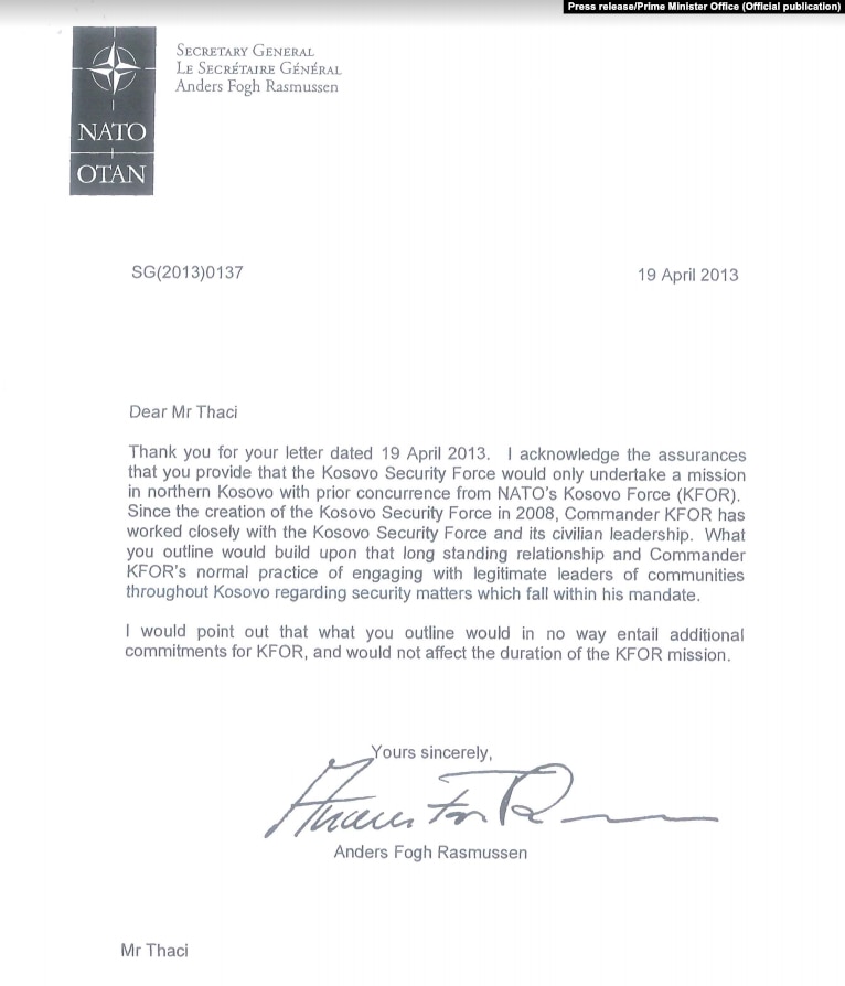 “Në emër të Qeverisë së Republikës së Kosovës, unë jap garanci se FSK-ja do të ndërmarrë mision në veri të Kosovës vetëm me pëlqimin paraprak të KFOR-it”, thuhet në letrën që mban nënshkrimin e Thaçit dhe datën 19 prill, 2013.