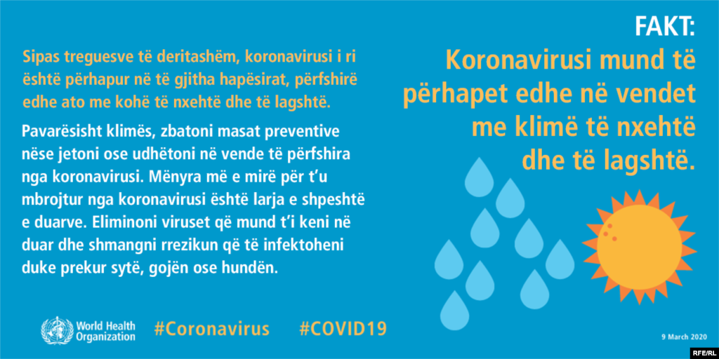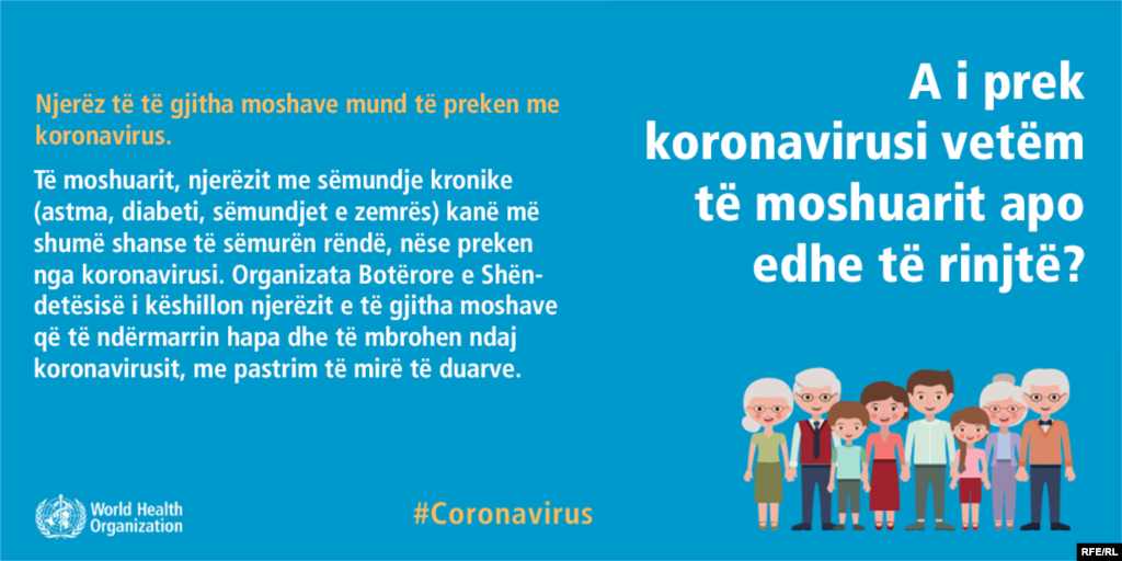 Për sa kohë mbijeton koronavirusi në sipërfaqe, a është rezistent ndaj motit të nxehtë apo të ftohtë, a janë të rinjtë më të mbrojtur dhe të moshuarit më të kërcënuar? Këto janë disa nga pyetjet në të cilat Organizata Botërore e Shëndetësisë i përgjigjet publikut përmes infografikave.